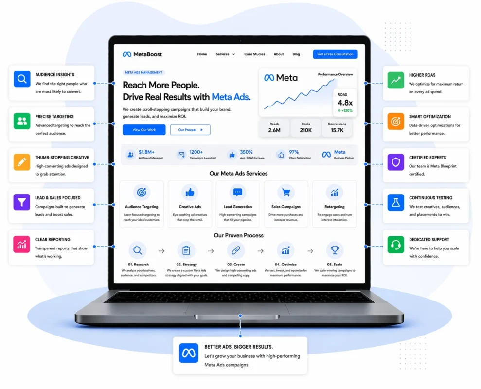 We follow a structured Meta Ads framework that balances audience targeting with creative testing. From campaign setup and audience segmentation to ad creative optimization, every step is measured against engagement, click-through rate, and conversion performance. This approach ensures ads reach relevant users while maintaining control over acquisition costs.