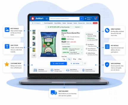 Consistency in product data, pricing, and availability is critical for success on JioMart. We optimize every operational touchpoint to ensure clarity, reliability, and smooth order fulfillment. Our approach supports buyer trust while reinforcing platform performance signals, helping brands achieve stable visibility and predictable sales growth.