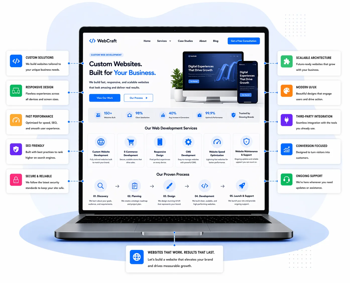 custom web development services with responsive website design coding interface and performance growth chart